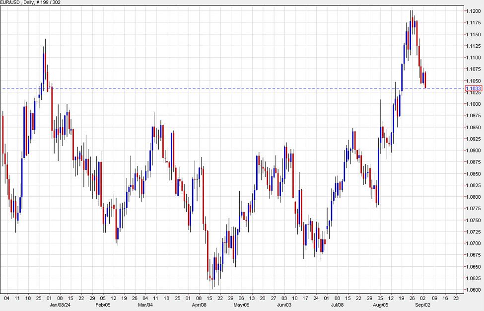What looked like a breakout to a one-year high only a week ago is now looking suspect. The euro easily fell back below the December highs and took out 1.1050 today.