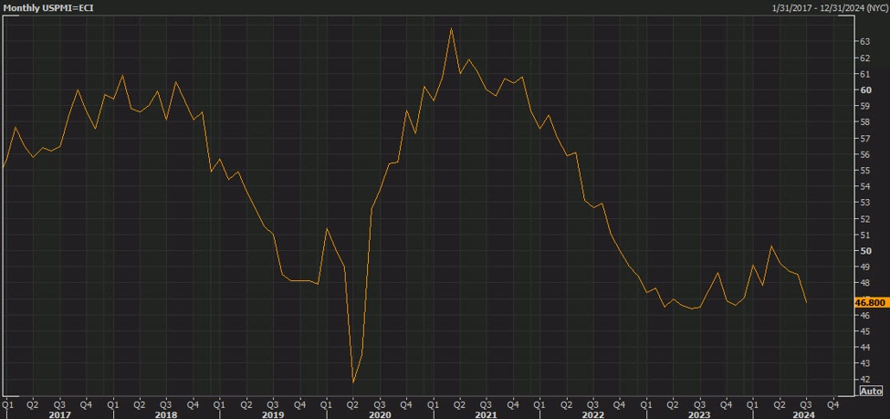 - New orders 44.6 versus 47.4 prior (lowest since May 2023)