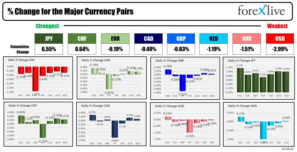 The fall in yields today helped to push the USD lower. The greenback is ending the day as the weakest of the major currencies, while the JPY continued its move to the upside with the USDJPY, trading near the lows for the day and looking to test the lows from last week near 143.67 and 143.39. The USDJPY fell -1.17% on the day and was the biggest moving currency pair of the majors.
