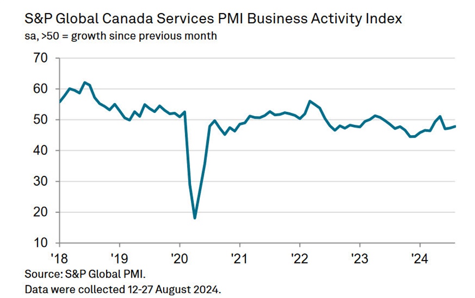- S&P Global Canada Services PMI rises slightly to 47.8 in August from 47.3 in July