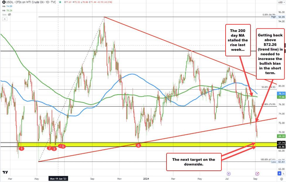 Crude oil futures is settling at $69.15 after trying to rebound for the first time in four trading days. It was not meant to be. The price is closing lower for the fourth consecutive day.