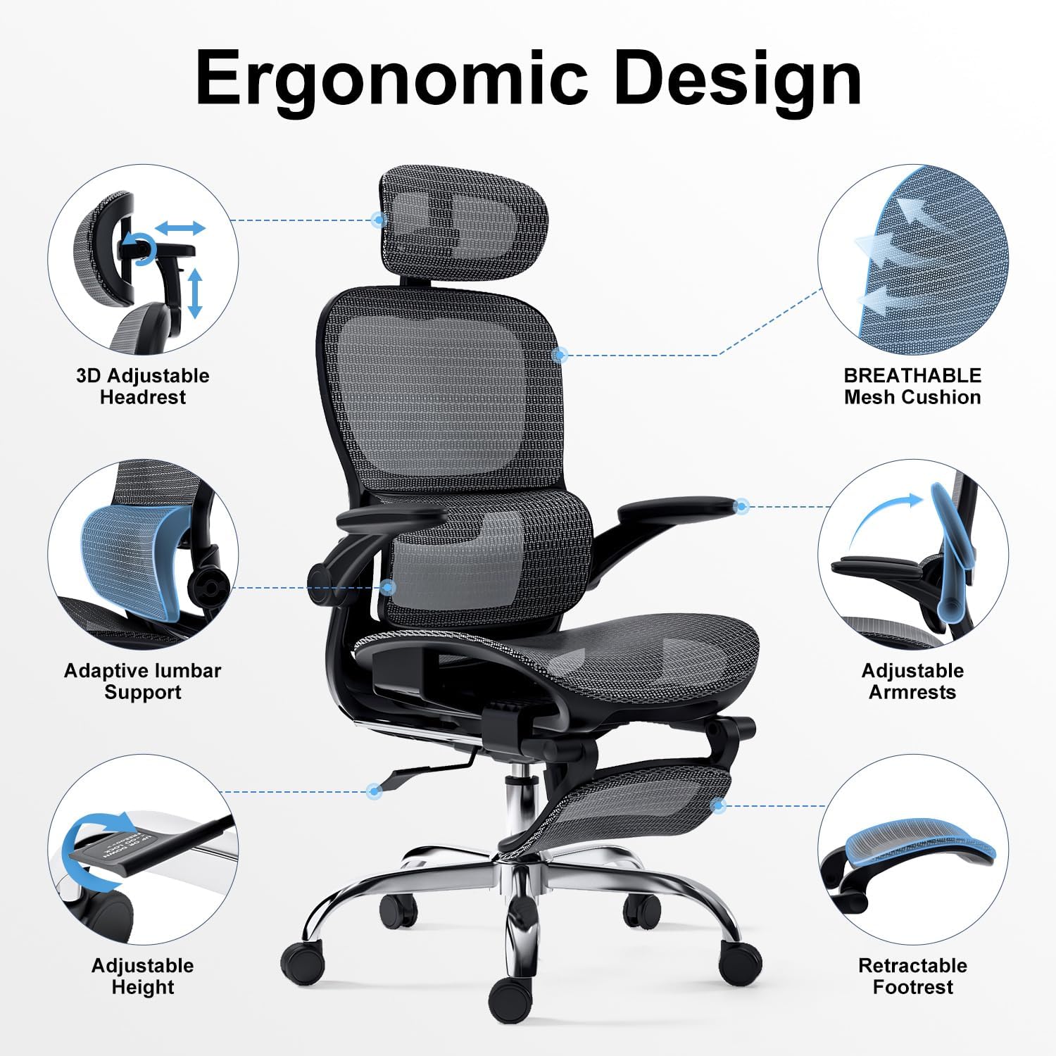 Ergonomic Office Chair: This ergonomic chair conforms to the curves of the body and allows easy adjustments for the headrest, armrests, seat height, backrest angle, and footrest, providing optimal support for the spine’s natural curve and ensuring users can customize it for maximum comfort