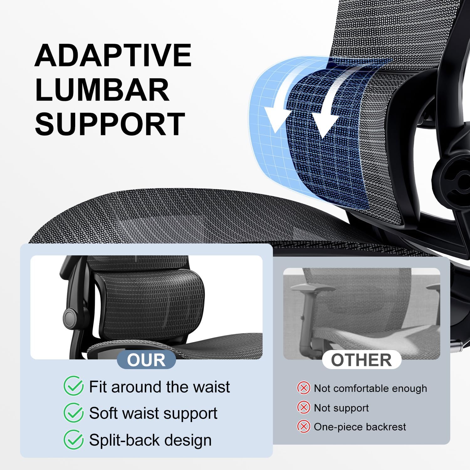 Adaptive Lumbar Support:This ergonomic chair features adaptive lumbar support, where the lumbar area adjusts automatically to fit the user’s posture, providing optimal support and relieving fatigue from prolonged sitting
