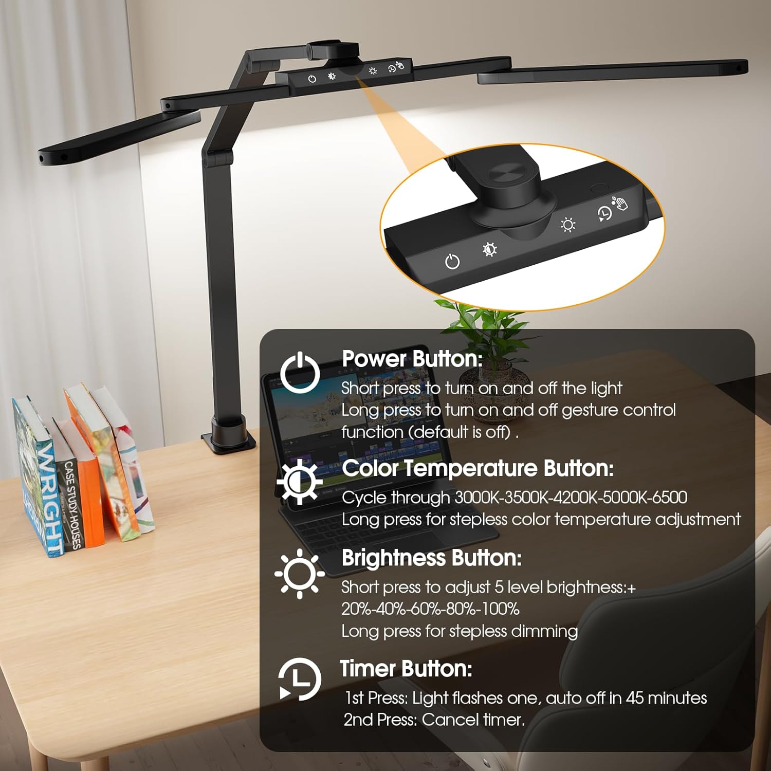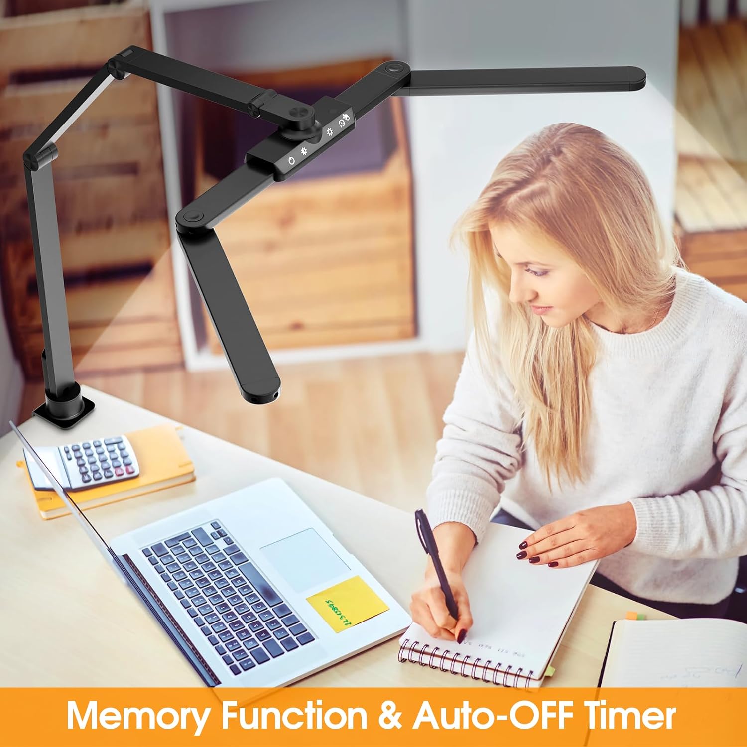 Auto-off Timer & Memory Function: This desk lamp features an auto-off timer, ensuring it will turn off automatically after 45 min to save energy. The built-in memory function retains your last used settings, allowing you to promptly resume your preferred lighting setup without any adjustment. This thoughtful feature makes the lamp an ideal companion for any productivity-focused environment