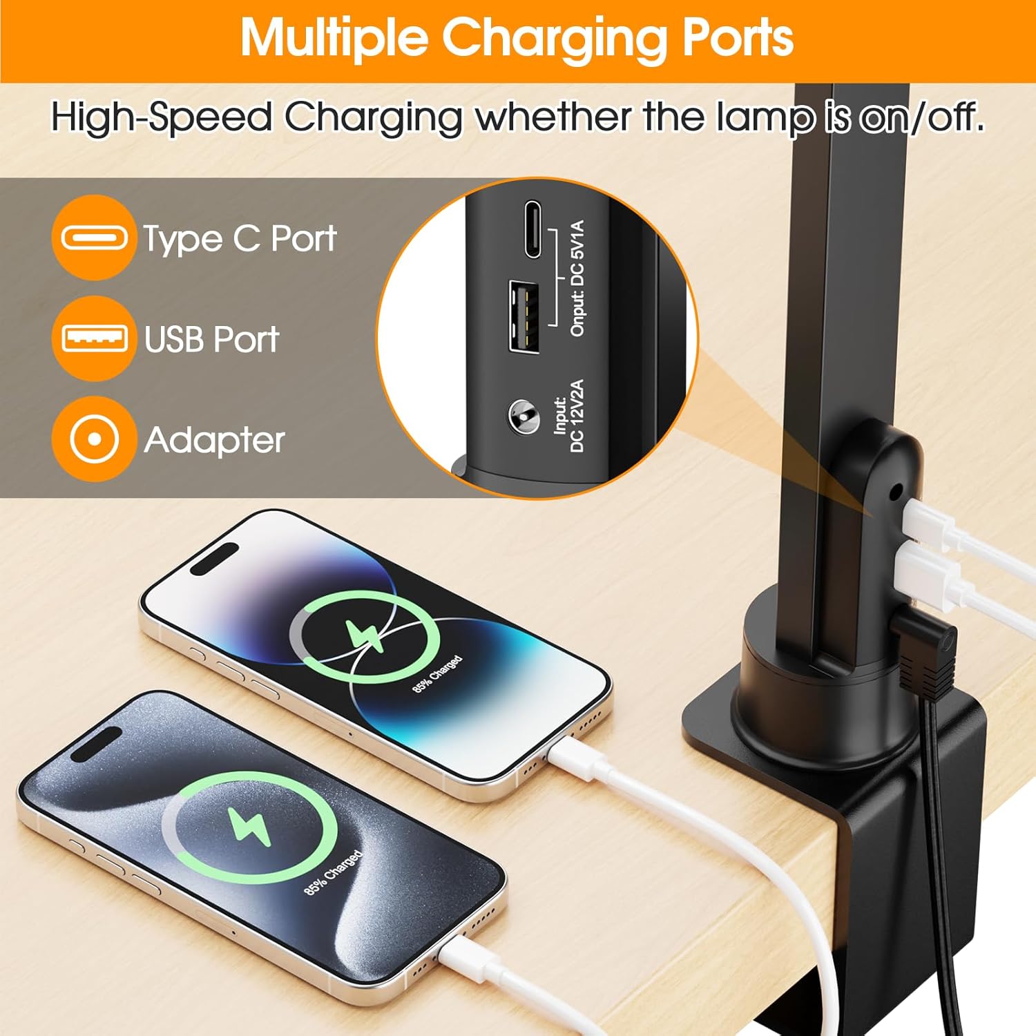 Addition USB & Type-C Charging Port: Say goodbye to cluttered desks and tangled wires with our desk lamp, designed with practicality in mind. The lamp body is equipped with both USB and Type-C charging ports, allowing you to charge two devices simultaneously while using the lamp. Whether it’s your smartphone, tablet, or any other electronic gadget, keep your essential devices powered up and within reach