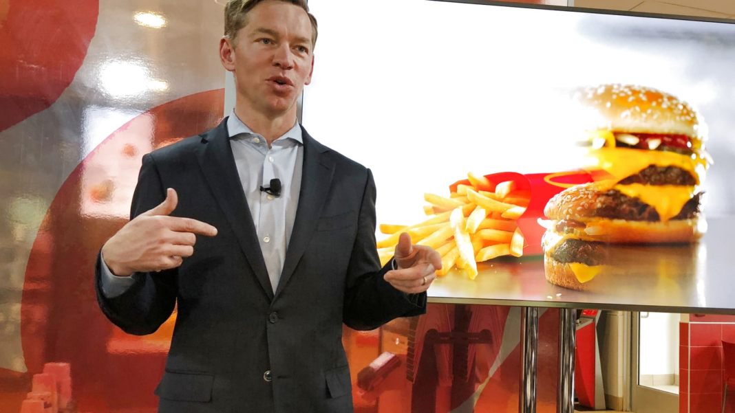 McDonald’s Chris Kempczinski speaks about fresh beef expansion at a McDonald’s event in Oak Brook, Illinois.