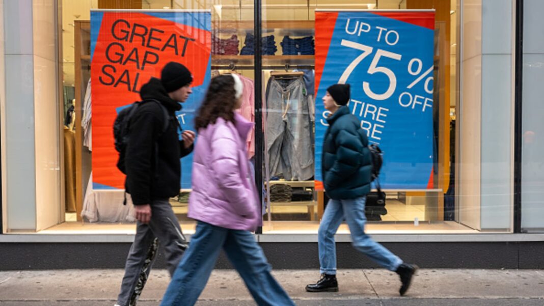 People walk by sale signs in the Financial District on the first day back for the New York Stock Exchange (NYSE) since the Christmas holiday on December 26, 2023 in New York City.