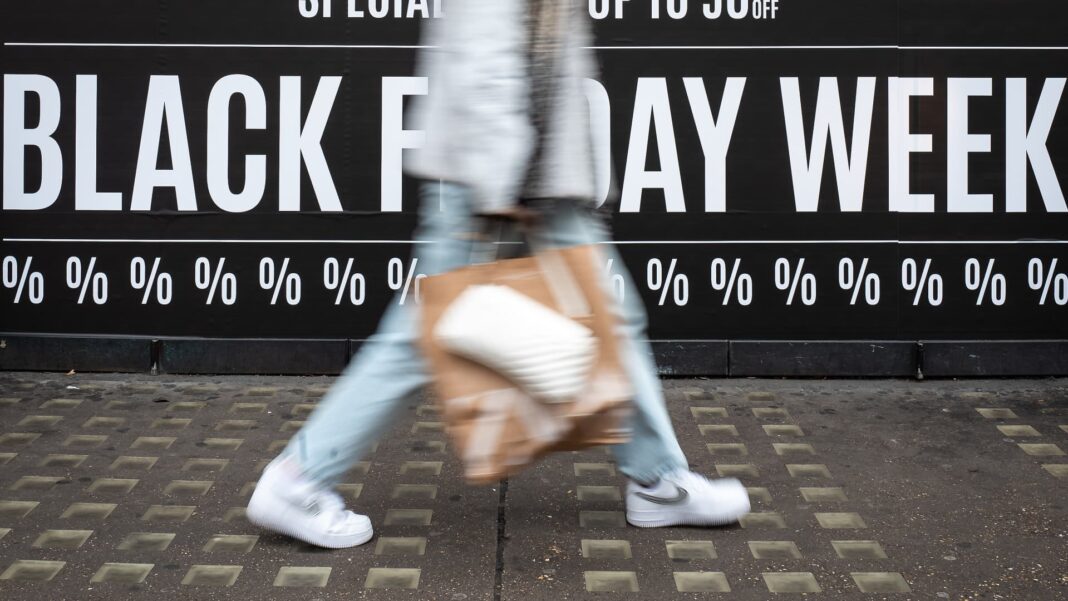 A shopper walks through the retail district near Oxford Circus in London during the annual Black Friday sale event, Nov. 26, 2021.