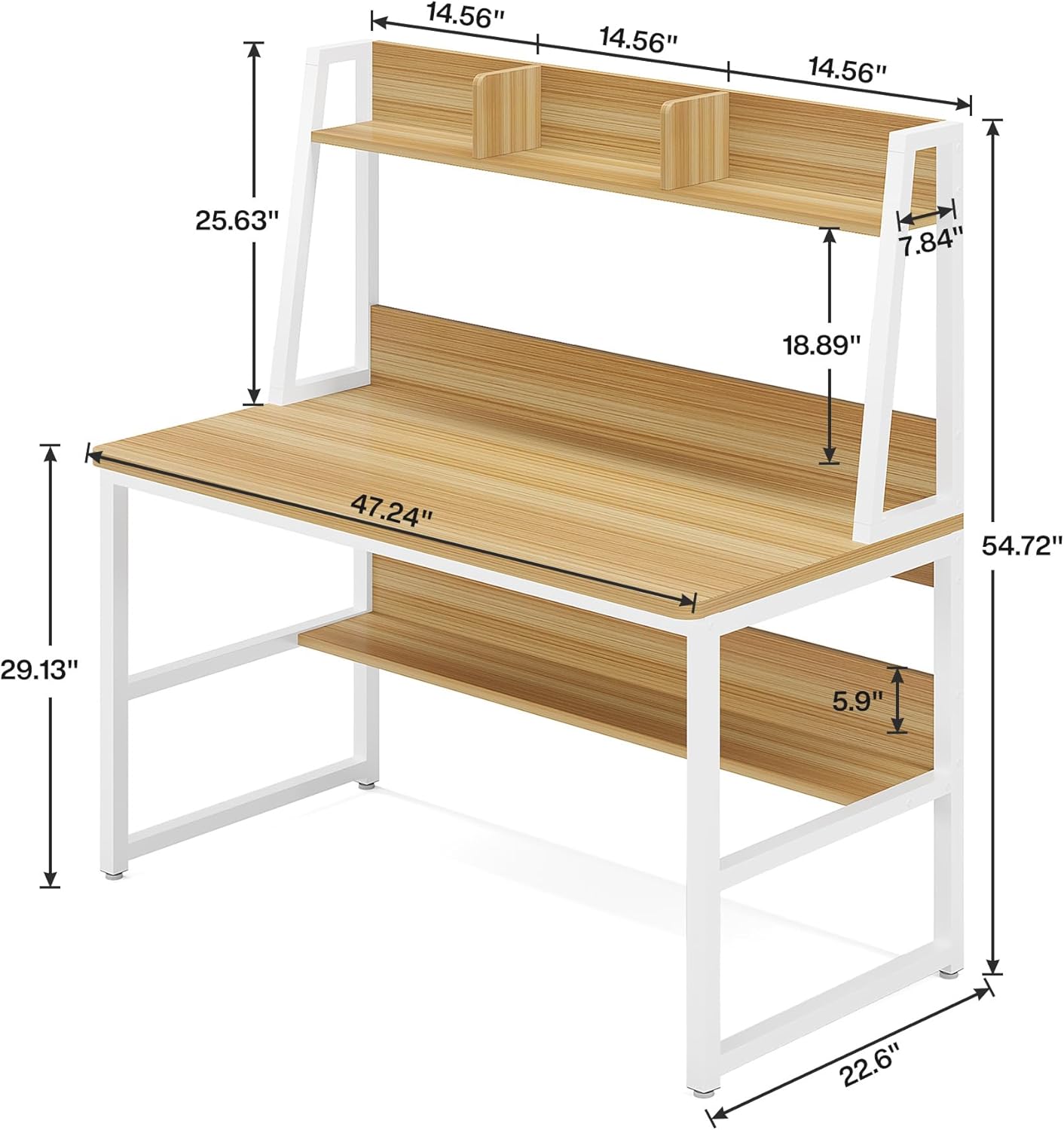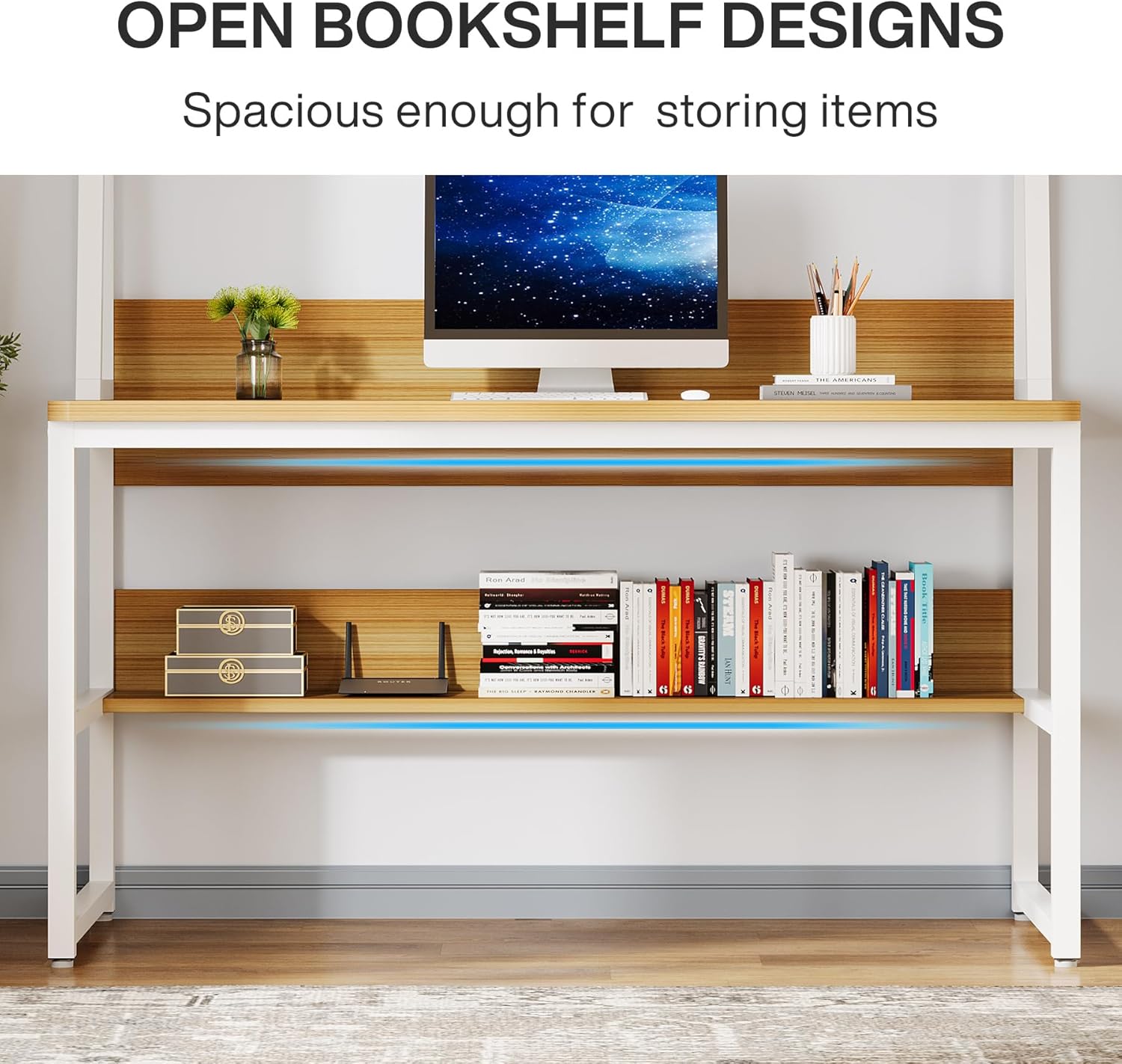 DESK & BOOKSHELF TWO-IN-ONE: Its vertical design features a open bookshelf and attached a hutch saves floor space while enhancing storage options. And even with all your stuffs it still feels spacious!