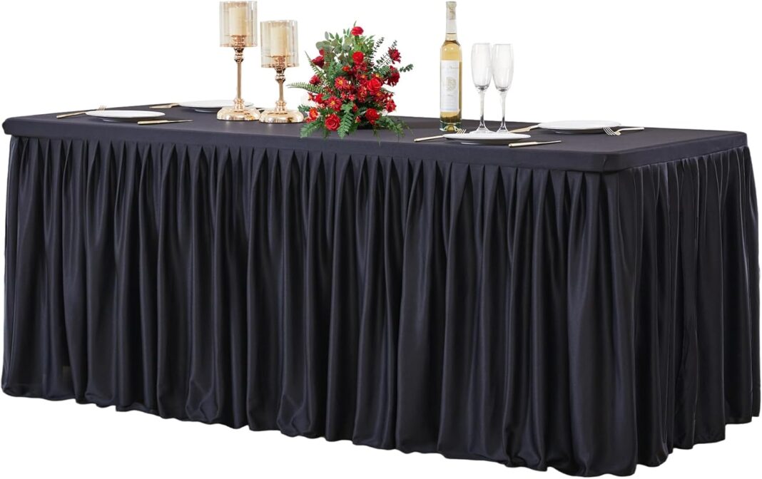 Material of 8 ft table cloth: This black 8ft rectangle tablecloth is made of wrinkle free and quality polyester fabric, the pleated bottom gives the table a clean and flawless look and hides the table legs. Stays firmly in place and doesn’t move much, even during usage or windy weather