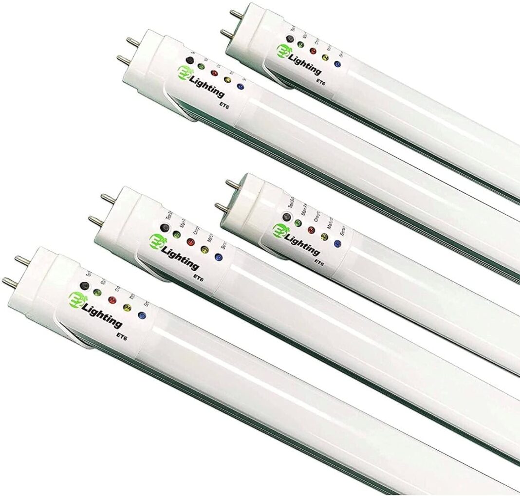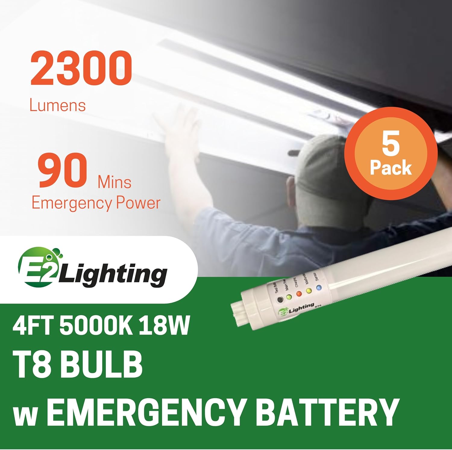 Introducing the E2 Lighting T8 Black Light Bulbs, a 48-inch, energy-efficient LED solution with an emergency battery backup, perfect for both residential and commercial use. This 4ft T8 LED bulb serves as an ideal replacement for traditional fluorescent tubes, offering a bright 5000K daylight color temperature to enhance visibility and ambiance. These T8 LED tubes are easy to install with a plug-and-play setup and a ballast bypass option for versatile compatibility across voltage ranges from 120-277V. Each 6W LED tube light in this 5-pack provides high efficiency and cost savings over conventional lights. The integrated emergency battery ensures dependable lighting during power outages, adding reliability to any space. Compatible with LED-compatible ballasts and available as dimmable, these T8 LED bulbs offer customization for different lighting needs. The E2 Lighting T8 LED tube light is a top-tier choice for seamless fluorescent-to-LED conversion, combining advanced design, efficiency, and peace of mind. Choose E2 Lighting for smart, reliable lighting upgrades.