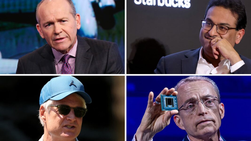 Clockwise from top: Former Boeing CEO Dave Calhoun (CNBC), Starbucks former CEO Laxman Narasimhan (Getty Images), former Nike CEO John Donahoe (Reuters), former Intel CEO Pat Gelsinger (Getty Images)
