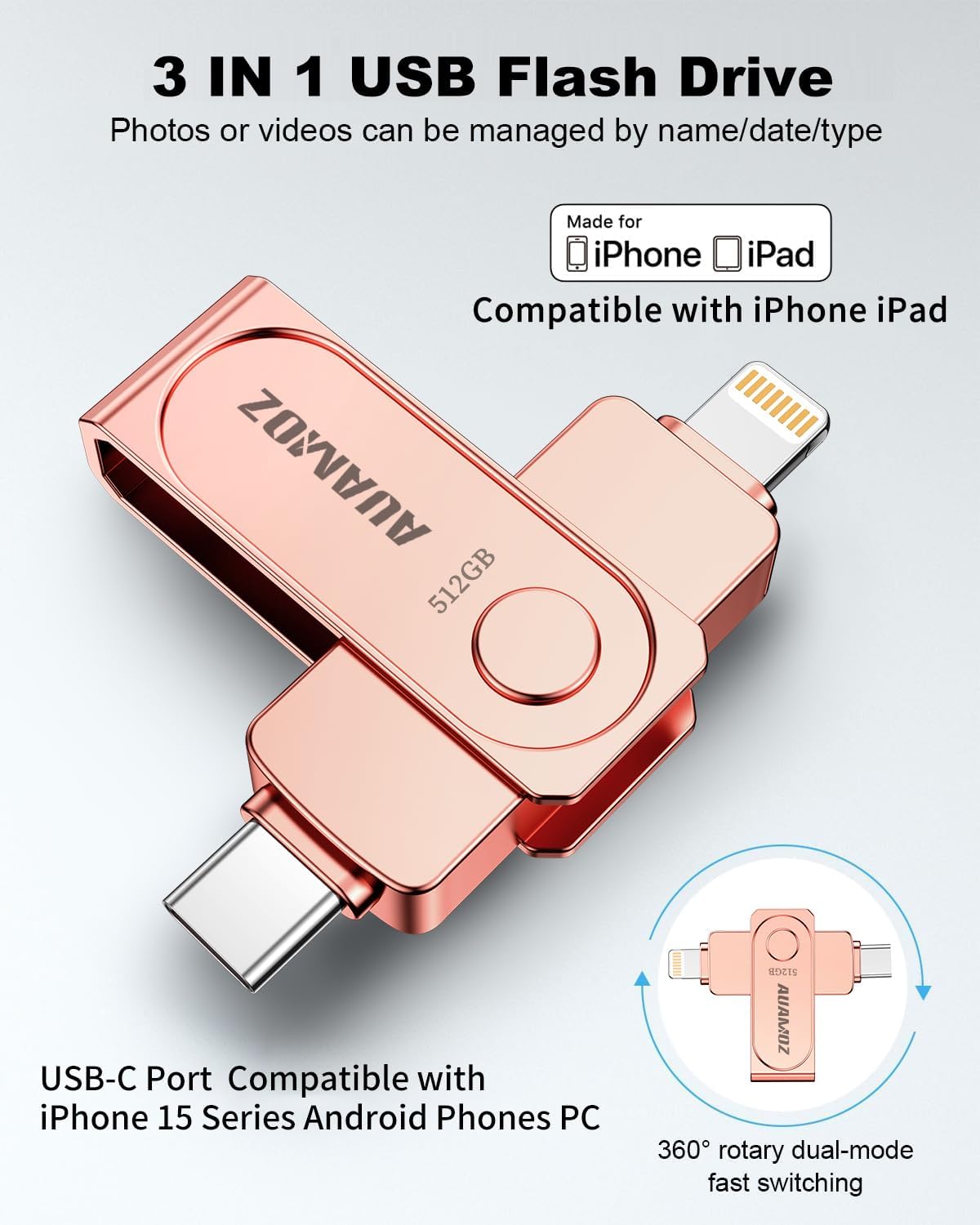 【One-Click Backup】Back up your files, photos, videos and Phone book with just one click. Our iphone photo stick is easy to use and comes with an APP that allows you to back up your data quickly and easily. Our iphone usb flash drive supports sharing photos to social media such as: Facebook, Twitter, etc., and you can even take photos or videos on our jump drive and save them directly to the drive. With 512GB of storage space, you’ll have more space and time to do what you love.