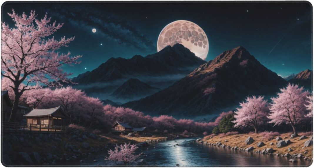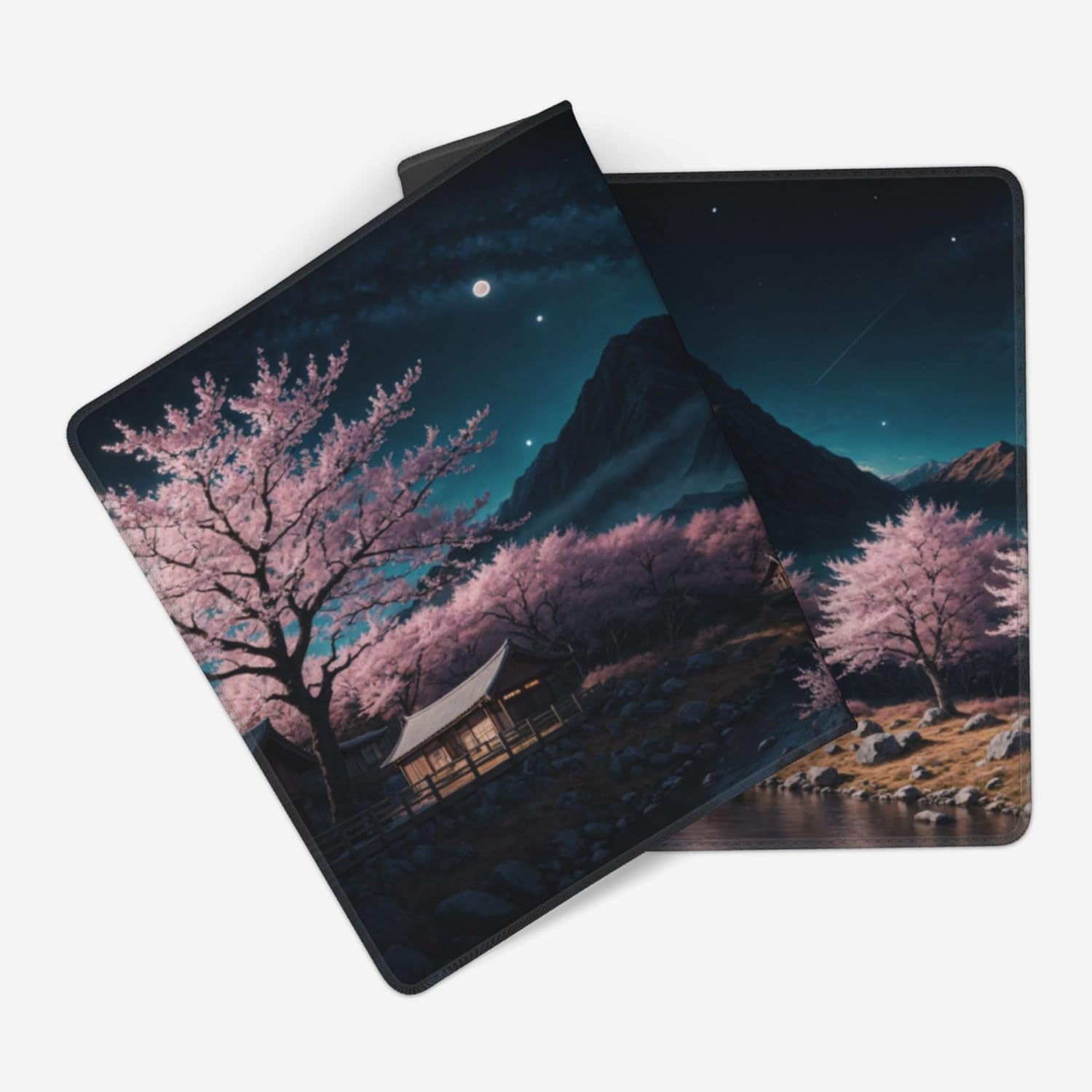 This is a playmat for Trading card game,MTG card game,the size is 23.5X13.7×0.1 inch.It is a picture of Cherry Blossom Moon Night .