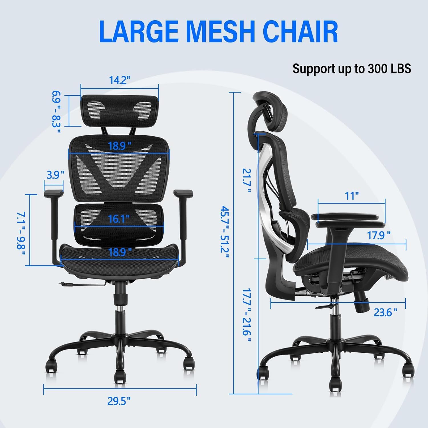 【Large Seat & Comfortable】 – The mesh office chair has an extremely larger back and wide seat(larger than other standard chairs), which makes it suitable for people of about 5’8″ to 6’4″. Further, the whole chair measures about 29.5″W x 23.6″D x 45.7″-51.2″H, the seat size: 18.5″W x 17″D x 17.7″-21.6″H, the whole back size: 21.7″L x 18.9″W, with a loading capacity of up to 300 lbs.