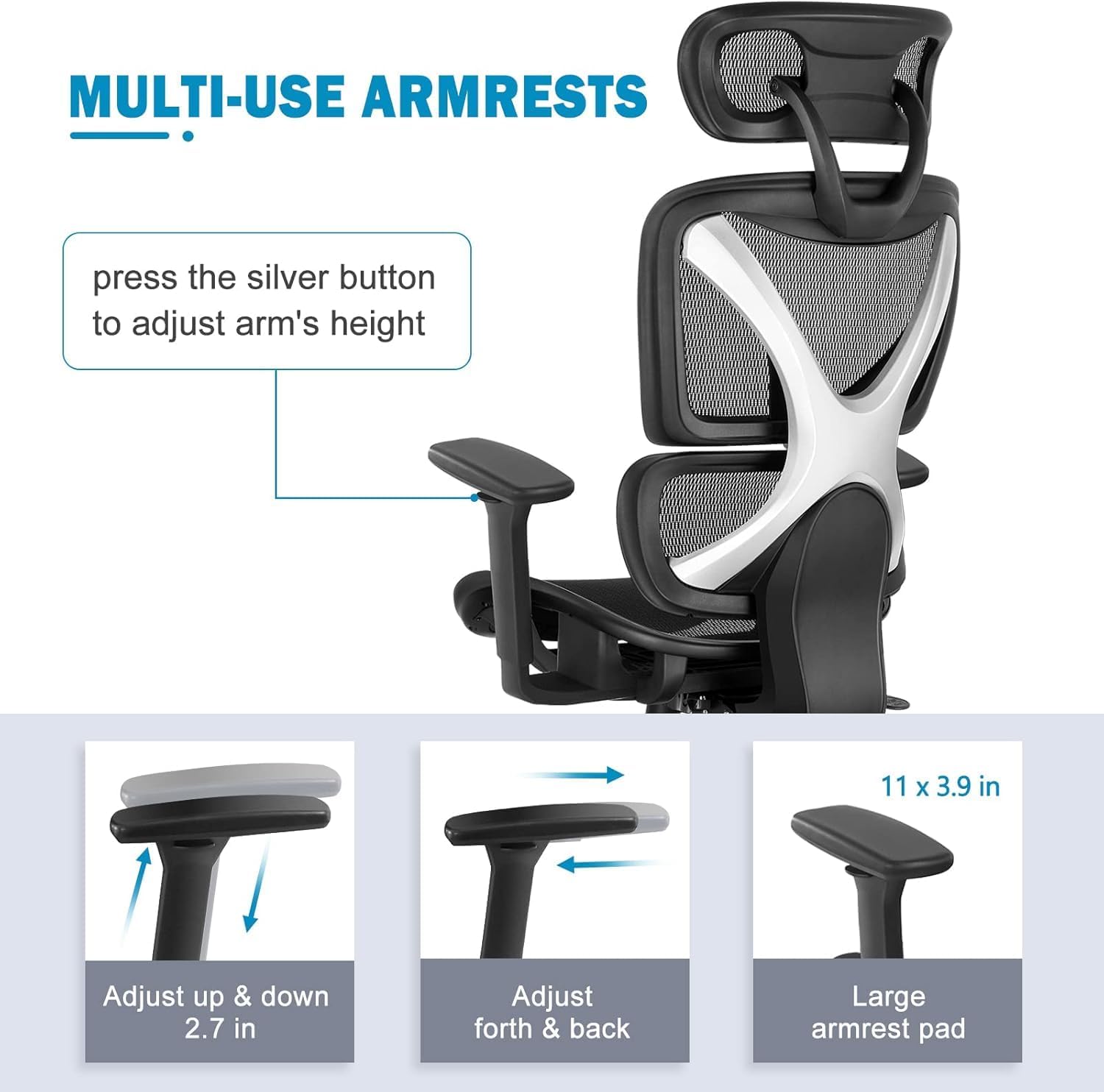 【Adjustable 3D Armrest & Headrest】 – The arms of the ergonomic office chairs can be adjusted up & down(2in), front & back(2.2in), in & out as per your sitting posture, which are sure to fully support your arms. The headrest too can be adjusted in both height and angle wise, so that the stress on the neck and shoulder is minimized.