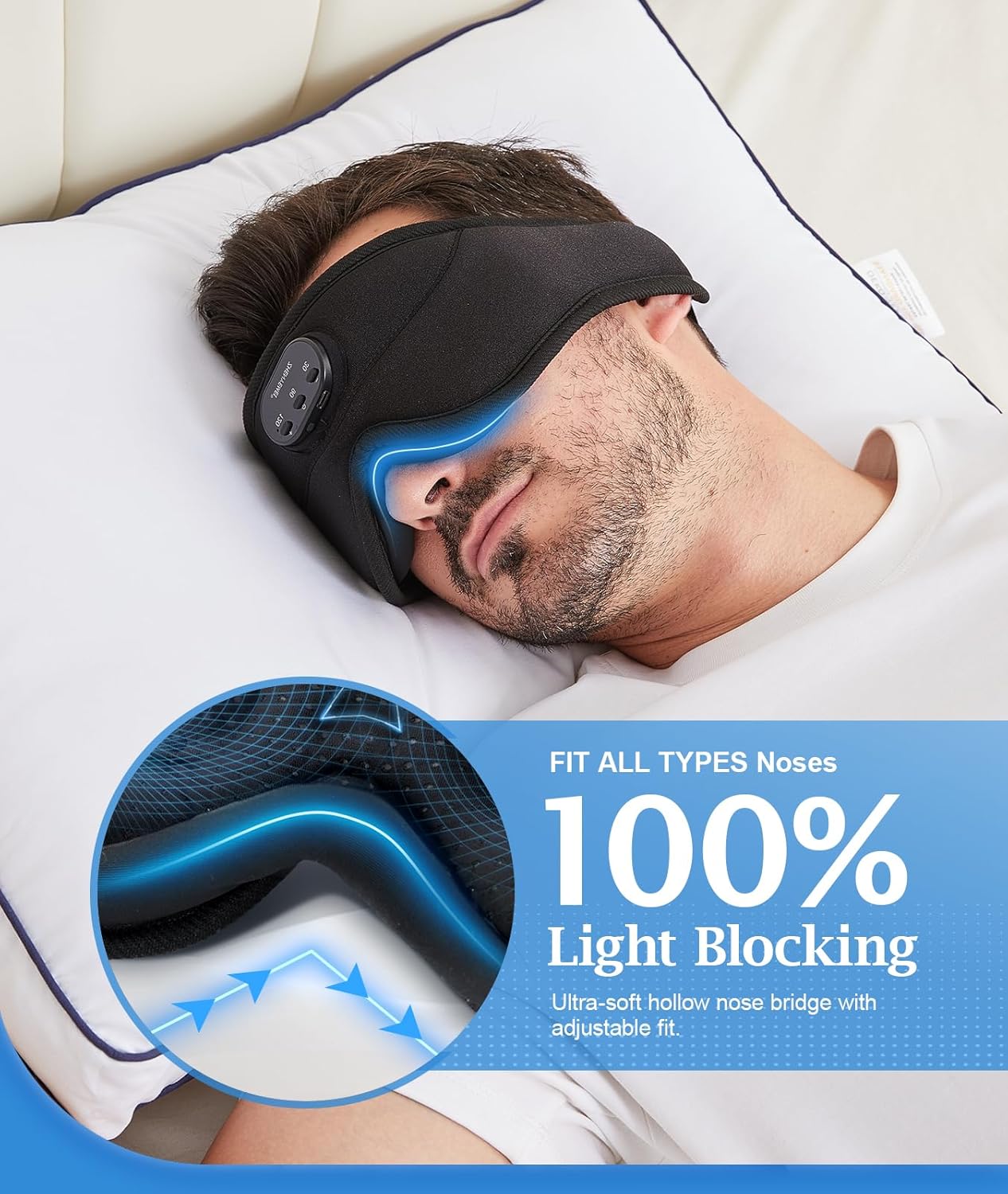 EFFECTICELY BLOCK LIGHT & TIMING- New improved wireless sleep mask are made of 99% pure mulberry silk. The unique design of the nose part can effectively block the entry of light and help you solve the problem of light interference when falling asleep. Also leave the white noise sleep mask on all night, or set a timer for 30, 90 or 120 minutes. Makes it ideal for relaxation, naps, yoga and meditation