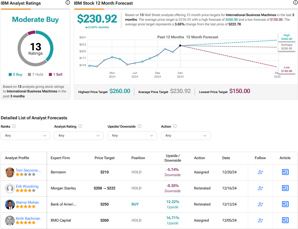Turning to Wall Street, IBM earns a Moderate Buy consensus rating based on five Buys, seven Holds, and one Sell rating assigned in the past three months. Furthermore, the average IBM stock price target of $230.92 per share implies 3.65% upside potential from current levels.