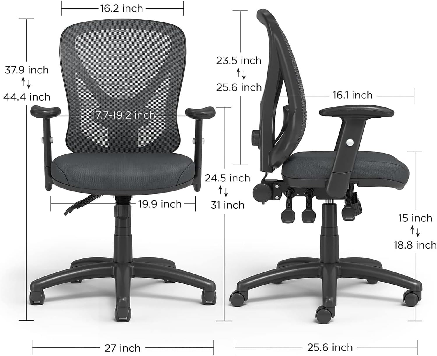 Overall dimensions: 37.9 – 44.4″H x 27″W x 25.6″D Seat dimensions: 19.5″W x 16.3″DWeight rated up to 275 lbs