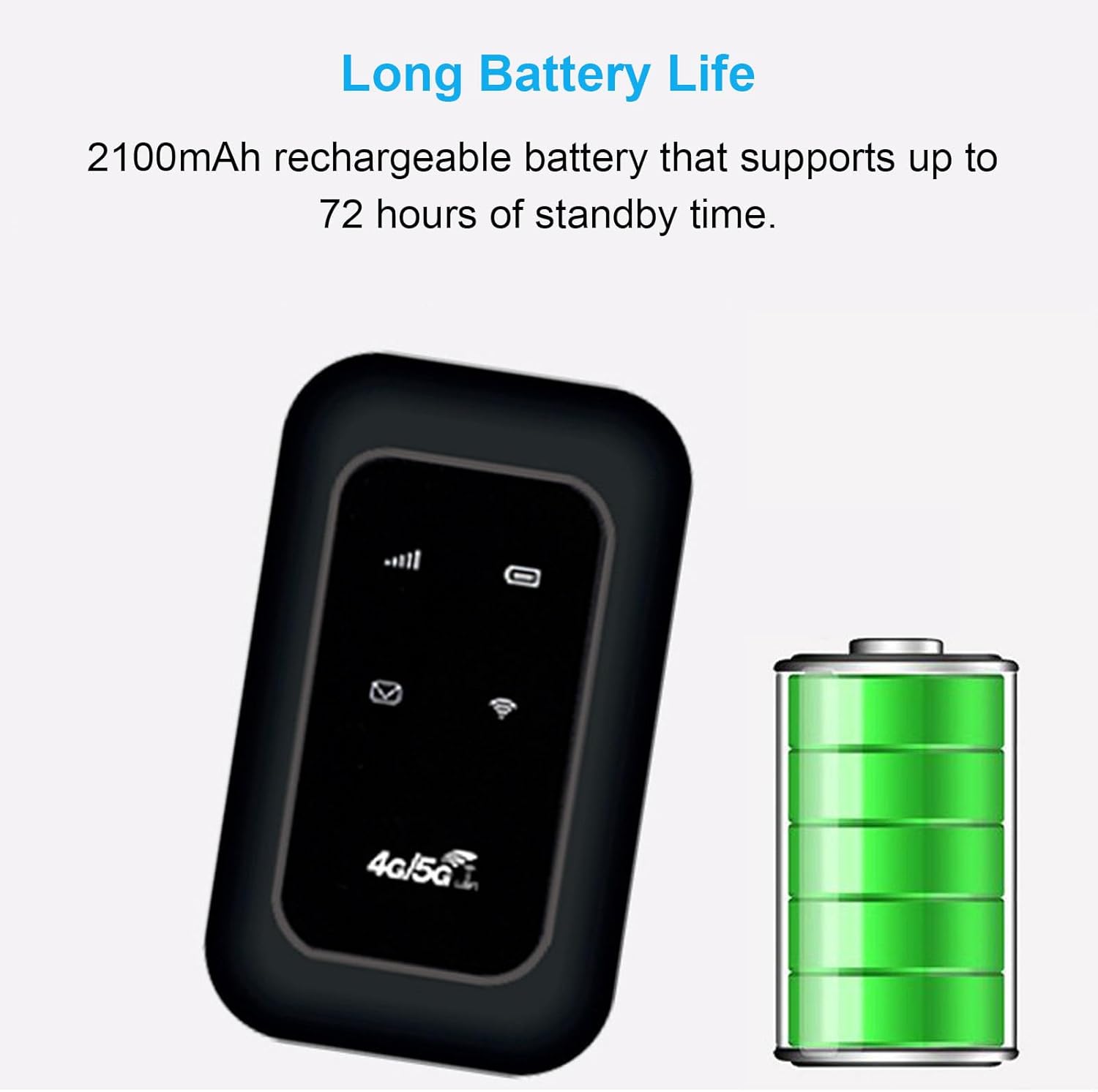 HIGH PERFORAMANCE: The Wi Fi router supports the LTE standard, its download speed is up to 150 Mbps, the upload speed is up to 50 Mbps. It is equipped with a LED smart screen display, 1 x SIM card slot, 1 x lithium battery 2100mAh (please charger more than 24 hours when first time charger), with up to 72 hours of standby time.