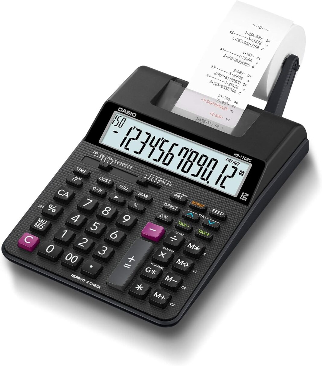 Printing calculator features a compact design that stores easily to let you work wherever you need. Two-color ink printer allows you to quickly see both positive and negative numbers to prevent reading errors. 12-digit LCD showcases crisp, sharp numbers for easy viewing. Dual-power operation lets you use plug directly into an outlet or use four AA batteries for on-the-go use. Calculator also includes a grand total key, cost/sell/margin, sign change, tax calculation, decimal selector and more.