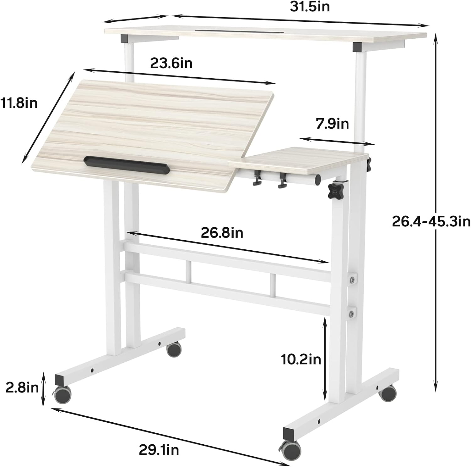 Dimension of the Laptop Desk :Overall size: 31.5″ width x 23.6″ depth x 27.6″- 45.3″ height. Adjustable desk with wheels, simple but practical, is suitable for small places and can match most home or office decor well.