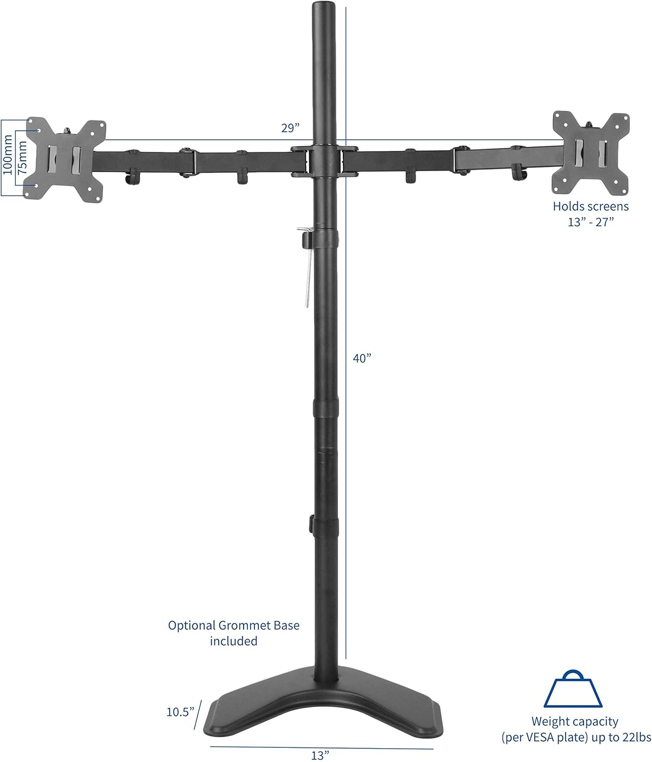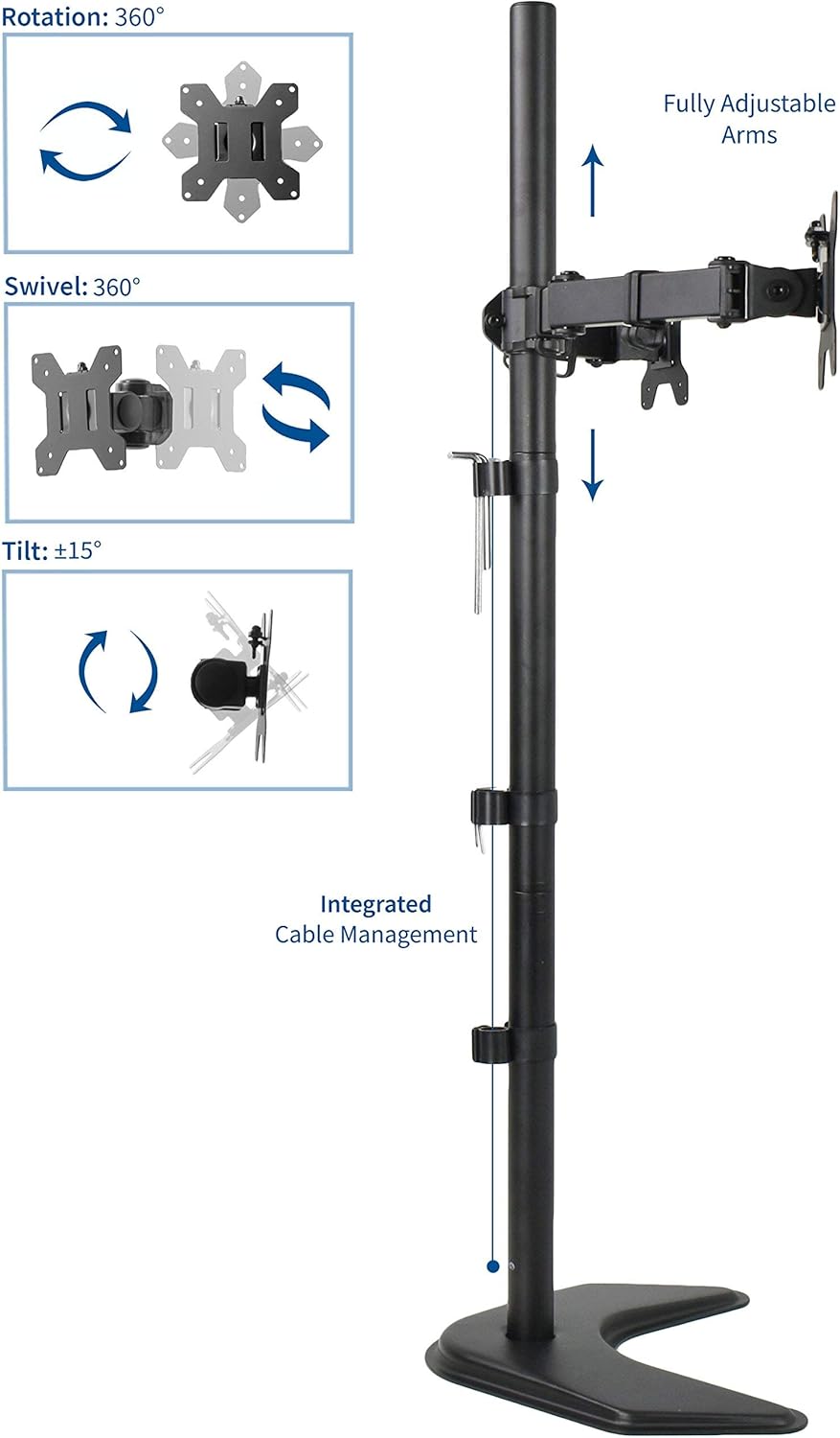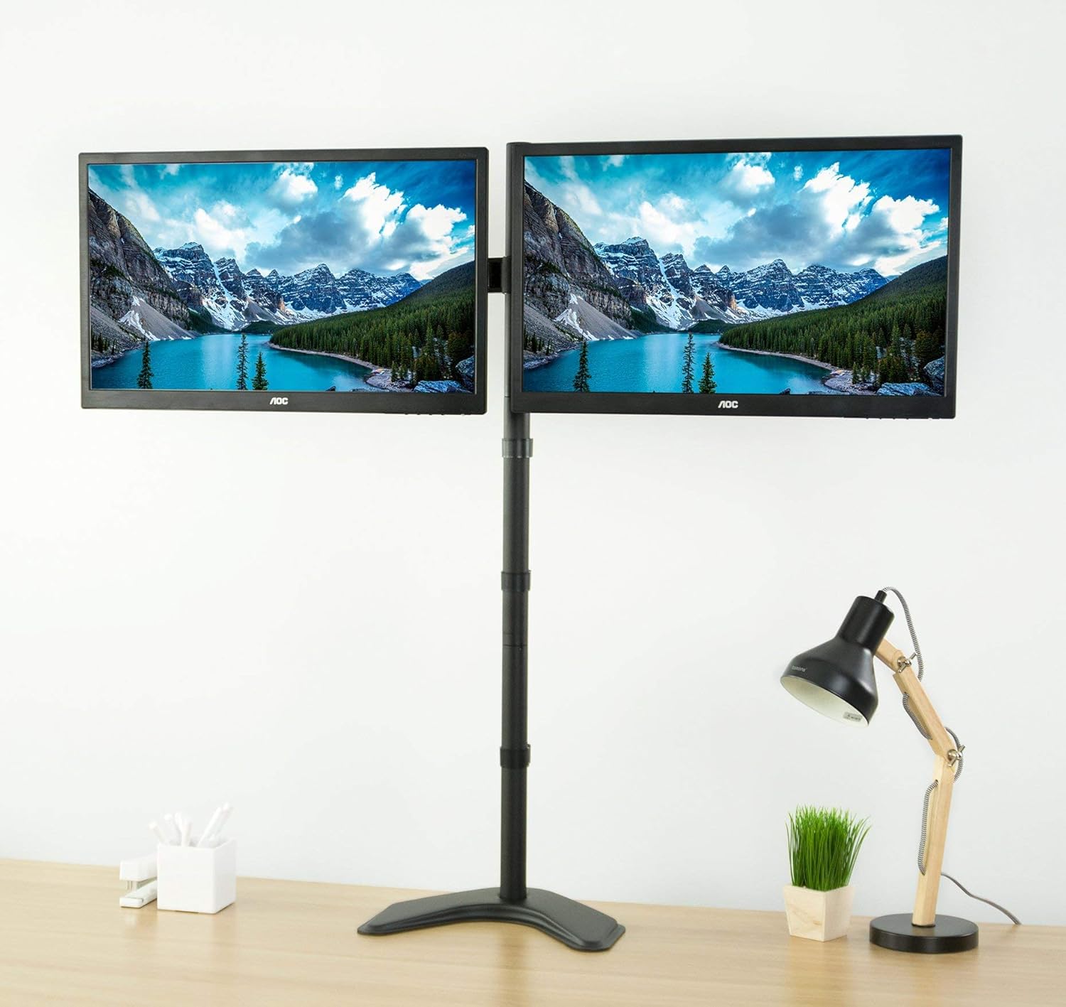 Complete your office space with a dual free-standing monitor mount from VIVO. Clear up workspace on your desk and enjoy the benefits of standing while working with this extra tall monitor stand. The 40″ center pole and adjustable computer screen height allow the user to adjust to either a sitting or standing position. High-grade steel and aluminum along with a heavy-duty base ensure your monitors will be kept secure. Mounting brackets are VESA compatible and support the majority of monitors on the market.