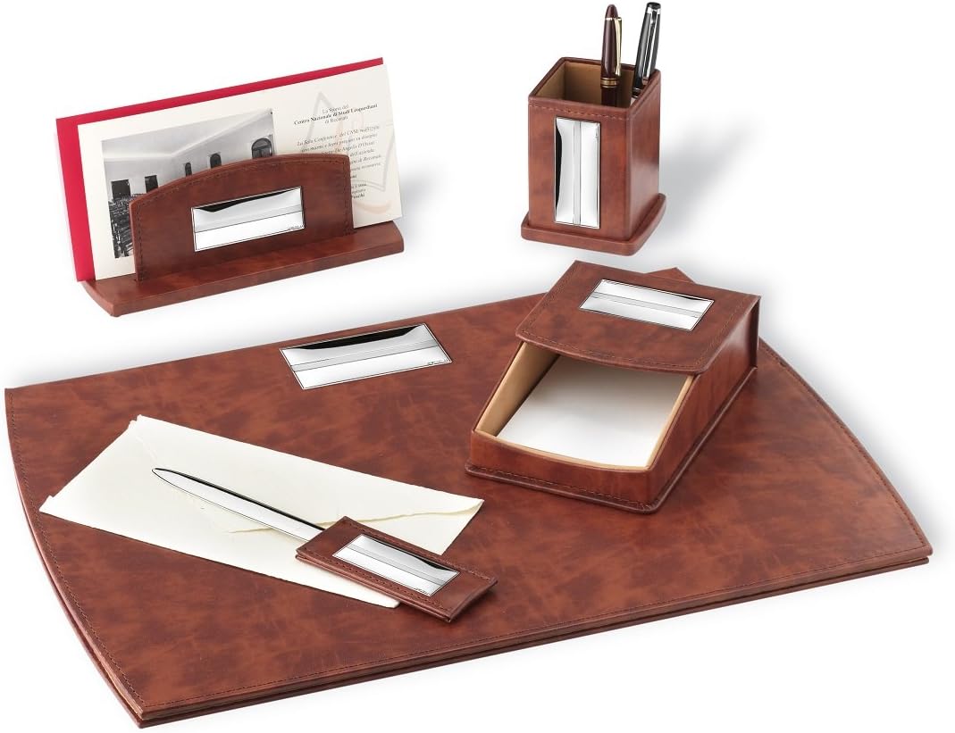 Very elegant a 5-piece executive desk organizer set, made from genuine leather and accented with .925 sterling silver