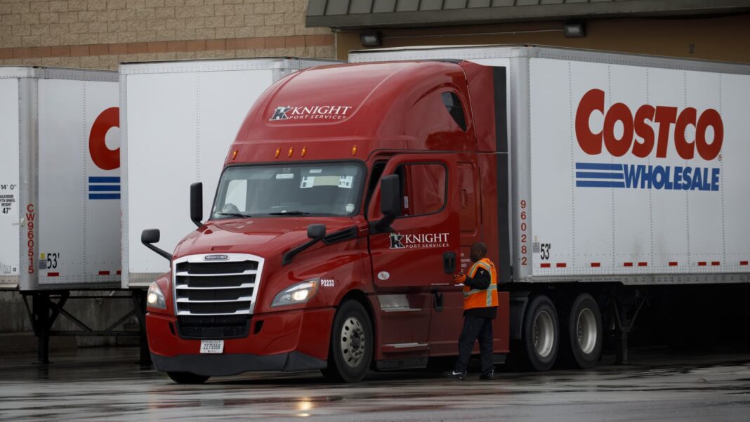 A truck driver climbs into a semitruck at a Costco Wholesale location in Hawthorne, California, on March 14, 2020.