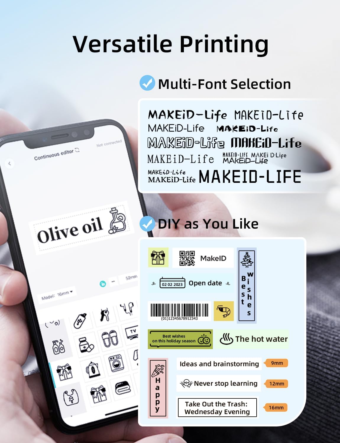 Print Labels Anytime, Anywhere: Create custom labels at home, school, or work! The MakeID label maker weighs only 125 g and prints multiple font styles, numbers, symbols, emojis, and icons