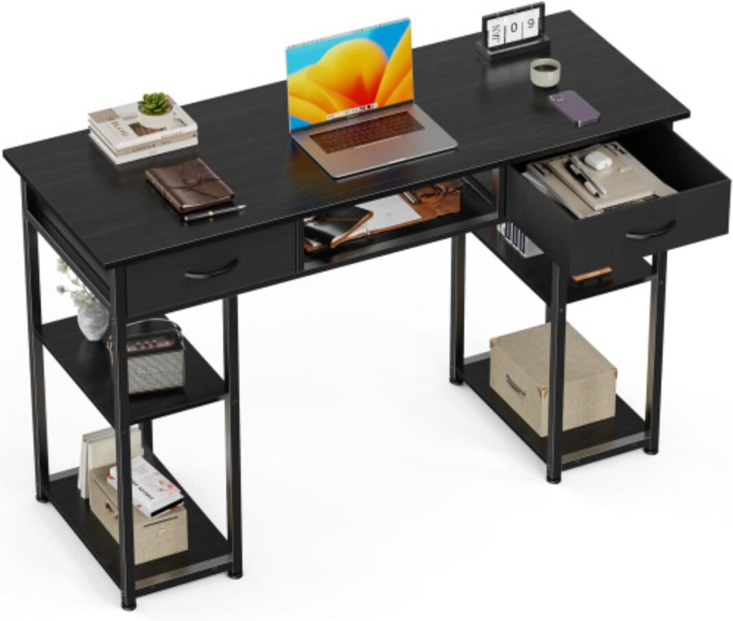AMPLE WORKSPACE: The home office desk provides a spacious surface to accommodate your monitor, laptop, and other essentials, ensuring you stay productive and organized during your workday. Overall dimensions: 47.24″ x 15.75″ x 30.6″. Drawer dimensions: 14.8″ x 13.4″ x 4.6″. Middle storage cabinet dimensions: 15.75″ x 4.72″ x 15.75″.
