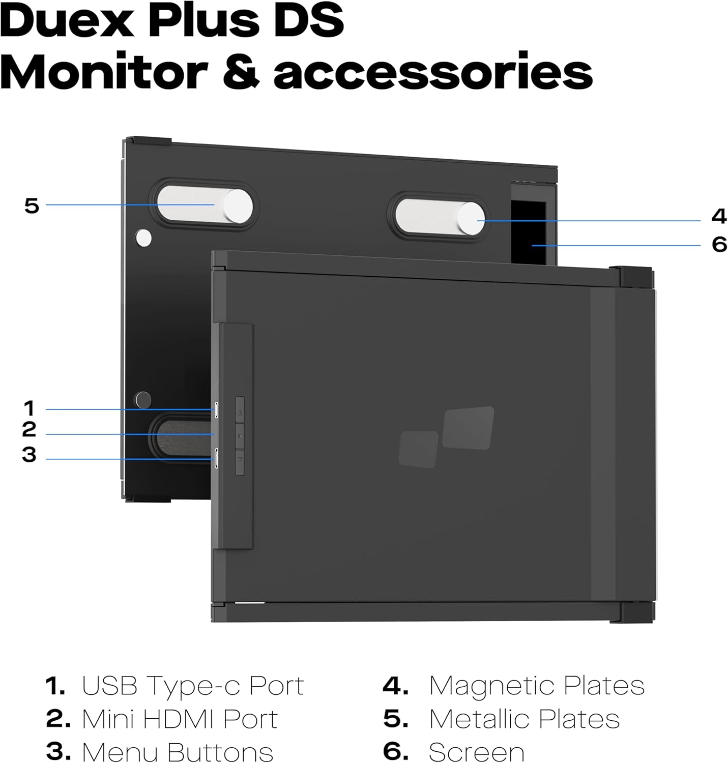 Multi-device compatibility: This Duex Plus DS laptop portable monitor is compatible with systems including Windows/Mac/Android/Switch; Equipped with a Mini-HDMI cable and a USB C cable, plug and play