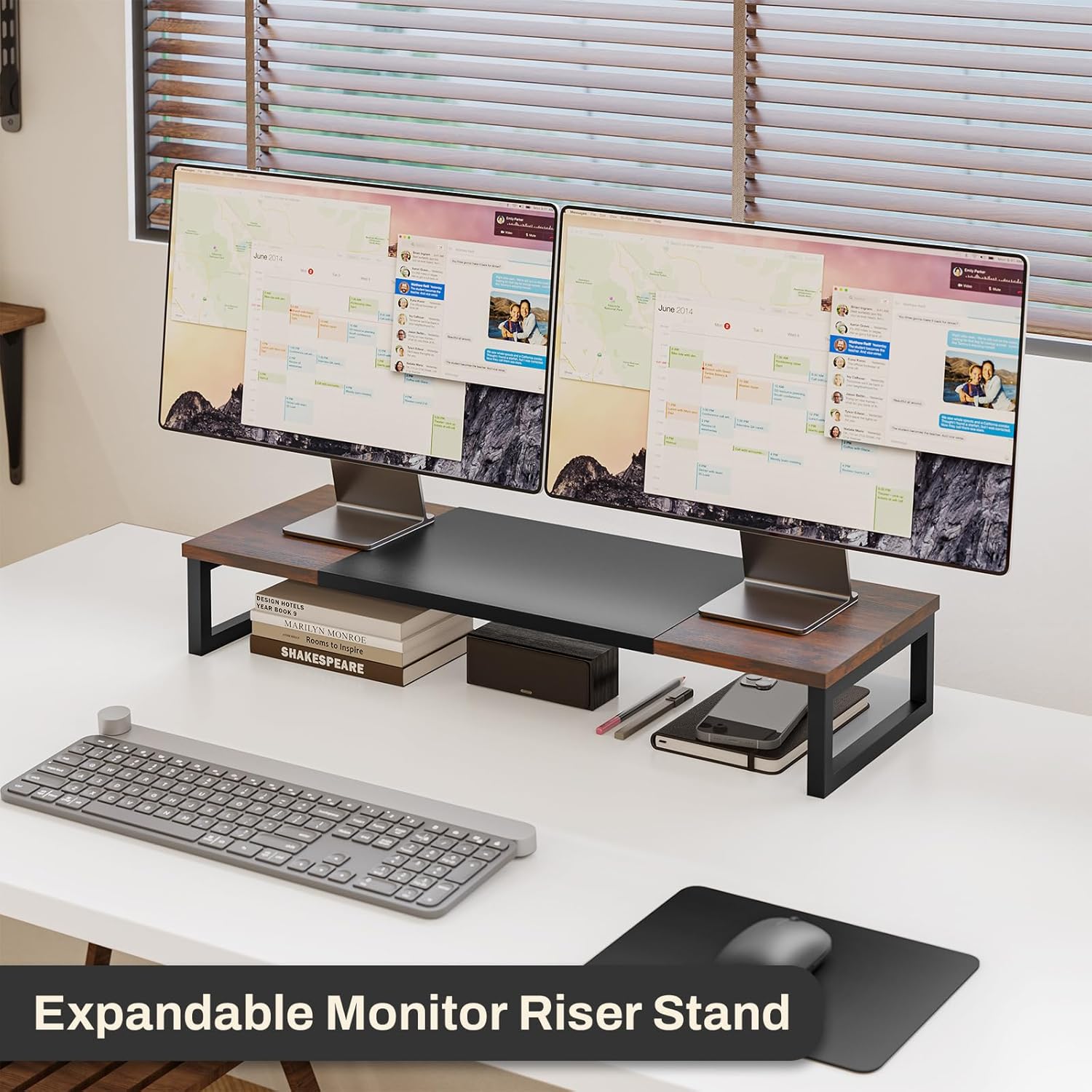 Transform your workspace into a place of efficiency and style with the SYDWORKSHOP Expandable Dual Monitor Stand. Designed with versatility and adjustability in mind, this premium monitor riser offers a flexible solution to your ergonomic needs, accommodating a wide array of monitor sizes and setups with an adjustable length from 27” to 36”. Whether you’re gaming, working, or simply enjoying your favorite shows, this stand ensures your setup is precisely tailored to your needs.