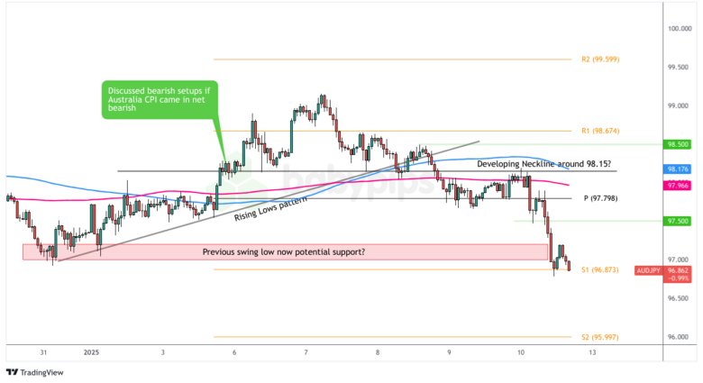 The yen’s gains were amplified by Finance Minister Kato’s warning about potential intervention against excessive currency moves, while RBA officials maintained their dovish stance. AUD/JPY made fresh weekly lows below S1 (96.87) during Friday’s session as broad USD strength and fading Fed rate cut expectations after a strong U.S. jobs report influenced cross-rate flows.