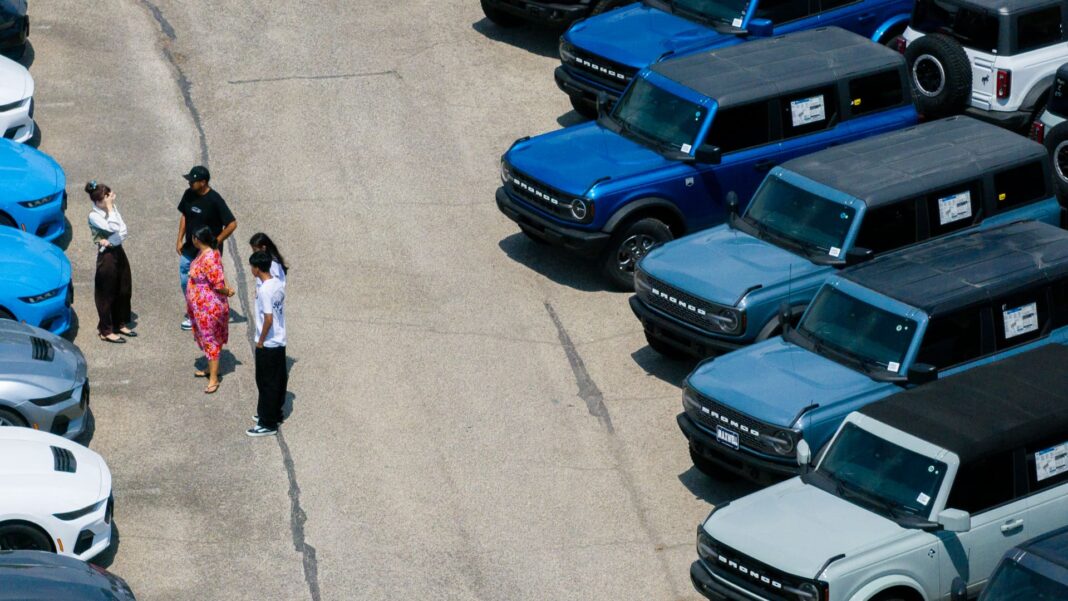 In an aerial view, Ford Broncos are seen for sale on a lot at a dealership on April 18, 2025 in Austin, Texas.