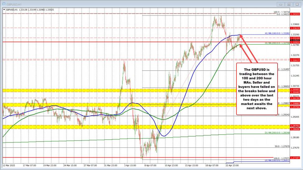 The GBPUSD moved up to test – and even break briefly – the 100-hour MA at 1.33282.The high price reached 1.3332.