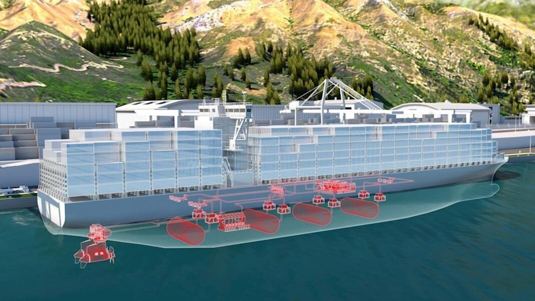 The project targets use of the system on various vessel types, including large seagoing ships such as container feeder vessels and liquefied hydrogen carriers.