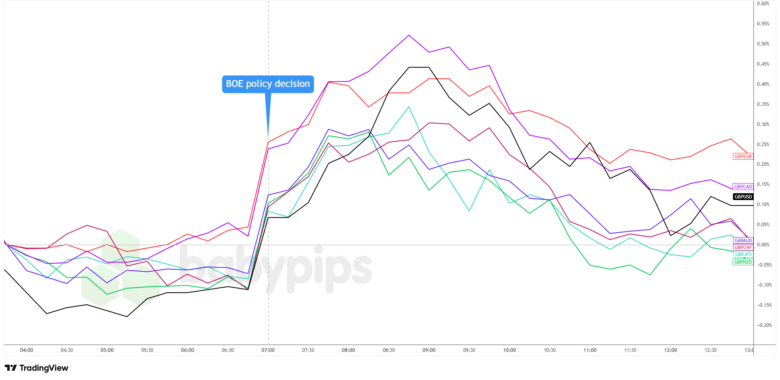GBP lost most of its post-BOE gains against several major currencies, though it managed to hold modest gains against USD, NZD, and EUR while closing lower against other majors like AUD, CAD, JPY, and CHF.