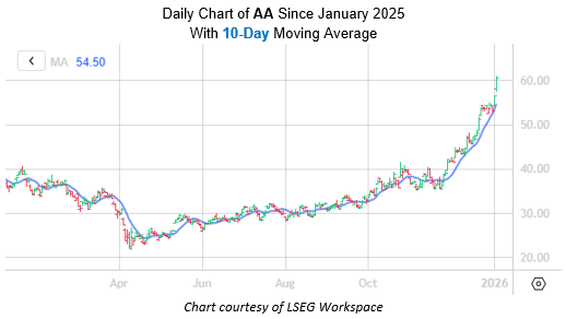 AA was higher one month later 60% of the time after those signals, averaging an 8% gain. From its current perch, a similar move would place the shares at $65.71 — their highest level since May 2022. Plus, in the event of a short-term pullback, underlying support at the 10-day moving average is also in place.