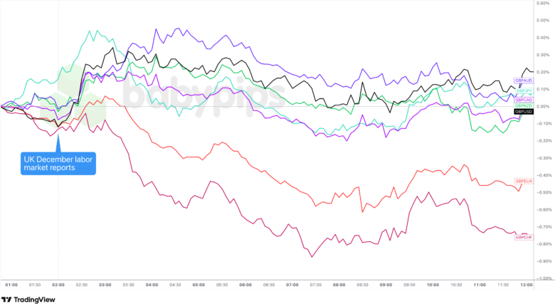 The British pound, which had been trading with mixed results ahead of the report, shot up broadly at the 7:00 GMT release. Sterling’s initial surge appeared driven by the in-line wage growth figures, which traders viewed as removing some pressure on the Bank of England (BOE) to accelerate interest rate cuts despite the weaker employment backdrop.