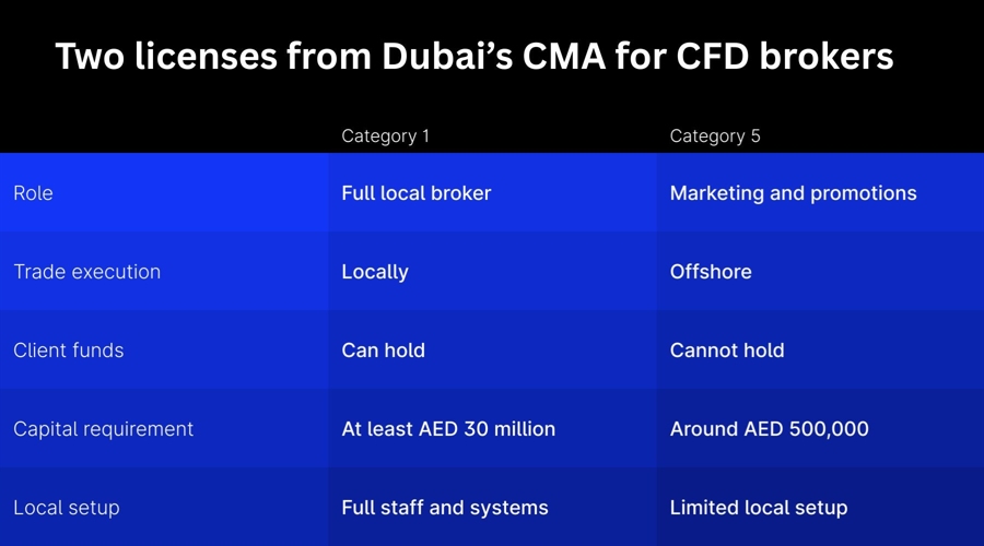 Under the Category 5 licence, brokers can market CFDs, onboard clients in a regulated way, and, in some cases, offer limited advisory or arrangement services. However, they cannot execute trades or hold client money locally.