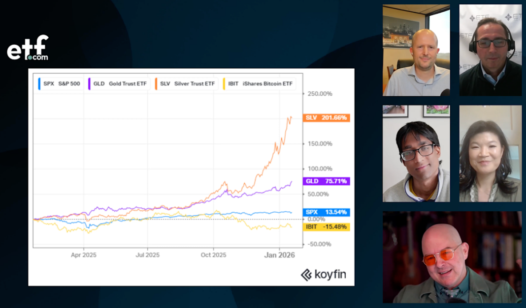 Nadig: Well, let’s shift then a little bit and talk about the sort of risk-on-risk-off nature, because that’s the other thing we talk about with bonds. And look, mean, precious metals have just been insane. Right. And this is silver, gold, SPY, and bitcoin. And look, this is not a pretty chart if you’ve been in anything but silver. Let’s just be clear about that.