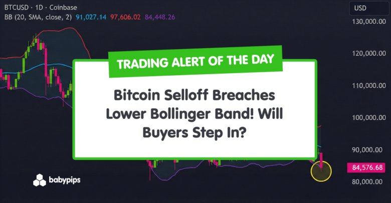 BTC/USD just had a big down day, dropping to ~84,400 and closing below the lower line of its Bollinger Bands.