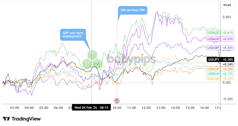 Mid-tier U.S. data presented a nuanced picture of the economy, with the services sector maintaining steady growth while private sector job creation slowed to a crawl in January, prompting mixed movements in the U.S. dollar across major currency pairs.