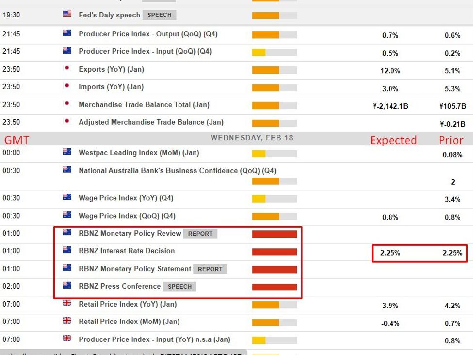 RBNZ statement due 18 February at 2pm New Zealand time (0100 GMT / 2000 US Eastern time on Tuesday 17 February). Previews: