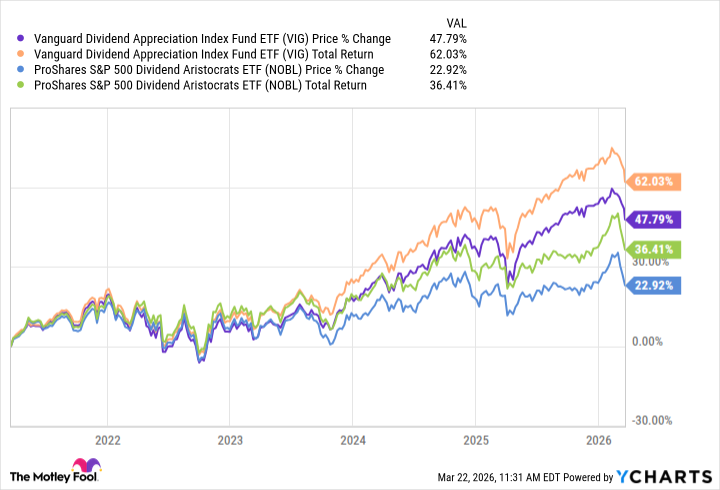 Both the Vanguard Dividend Appreciation ETF (NYSEMKT:VIG) VIG and the ProShares S&P 500 Dividend Aristocrats ETF (NYSEMKT:NOBL) target companies with a proven record of growing dividends. Their approaches, however, diverge.